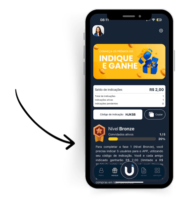 • Visualizar o saldo de indicações (exemplo: R$ 2,00).