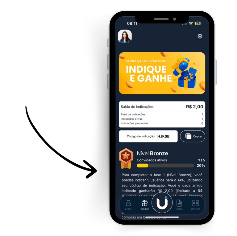 • Copiar seu código de indicação para compartilhá-lo com amigos.