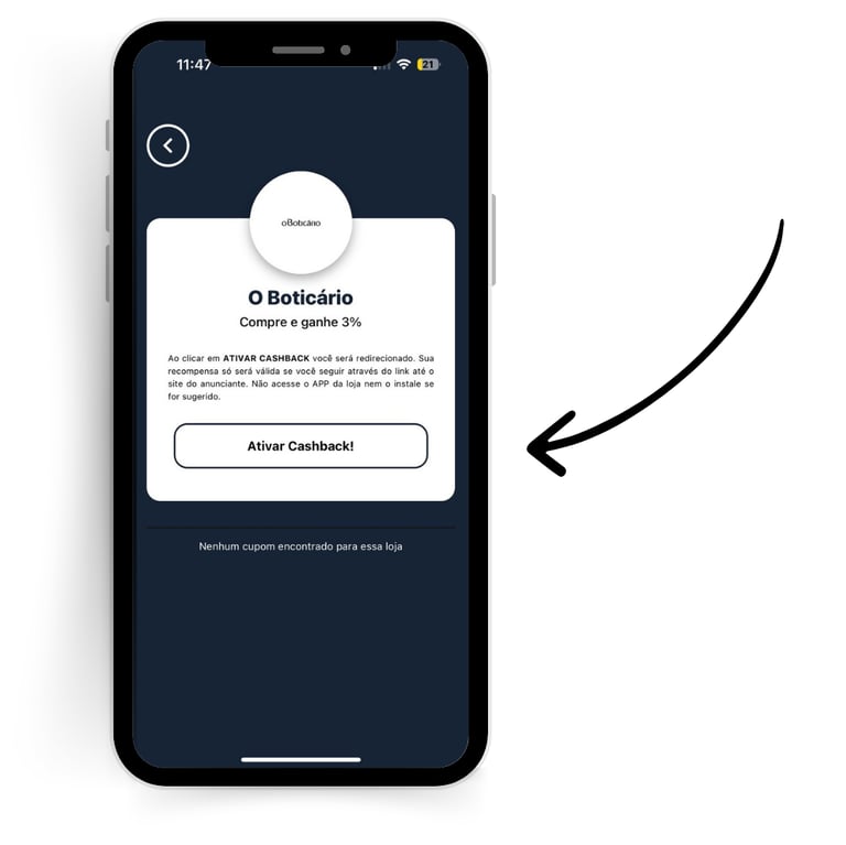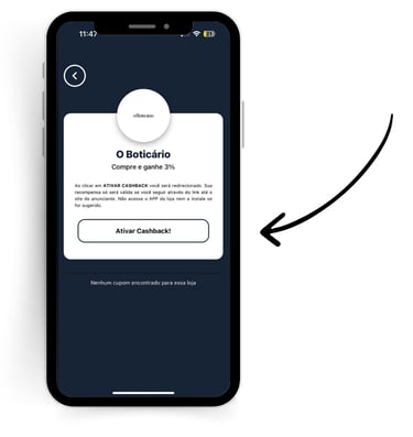 • Clique em Ativar Cashback, e você será redirecionado para o site.
