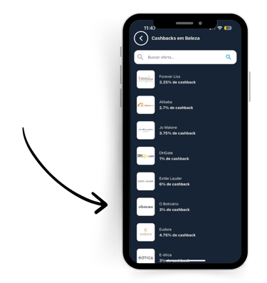 • Escolha a loja onde deseja ativar o Cashback.